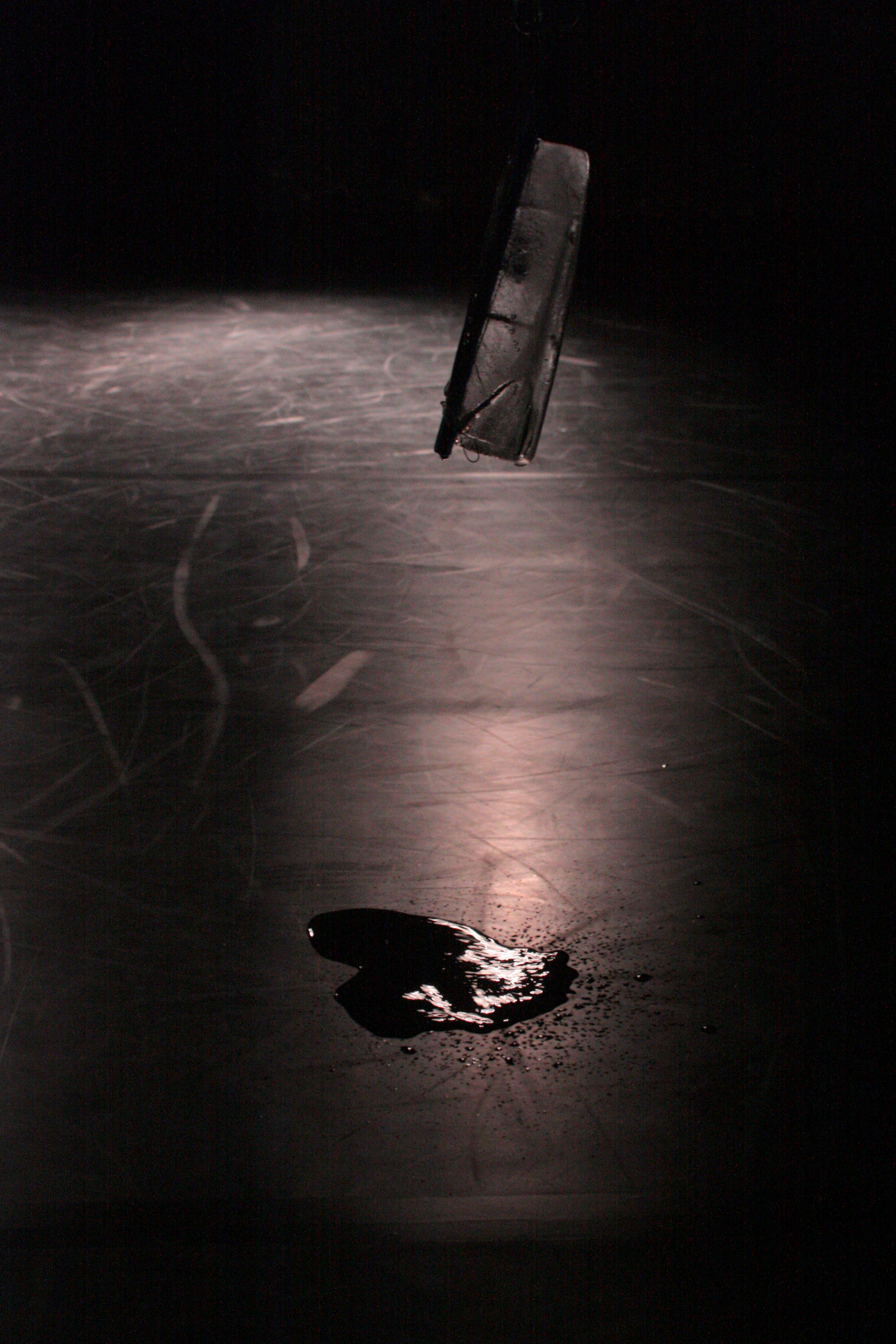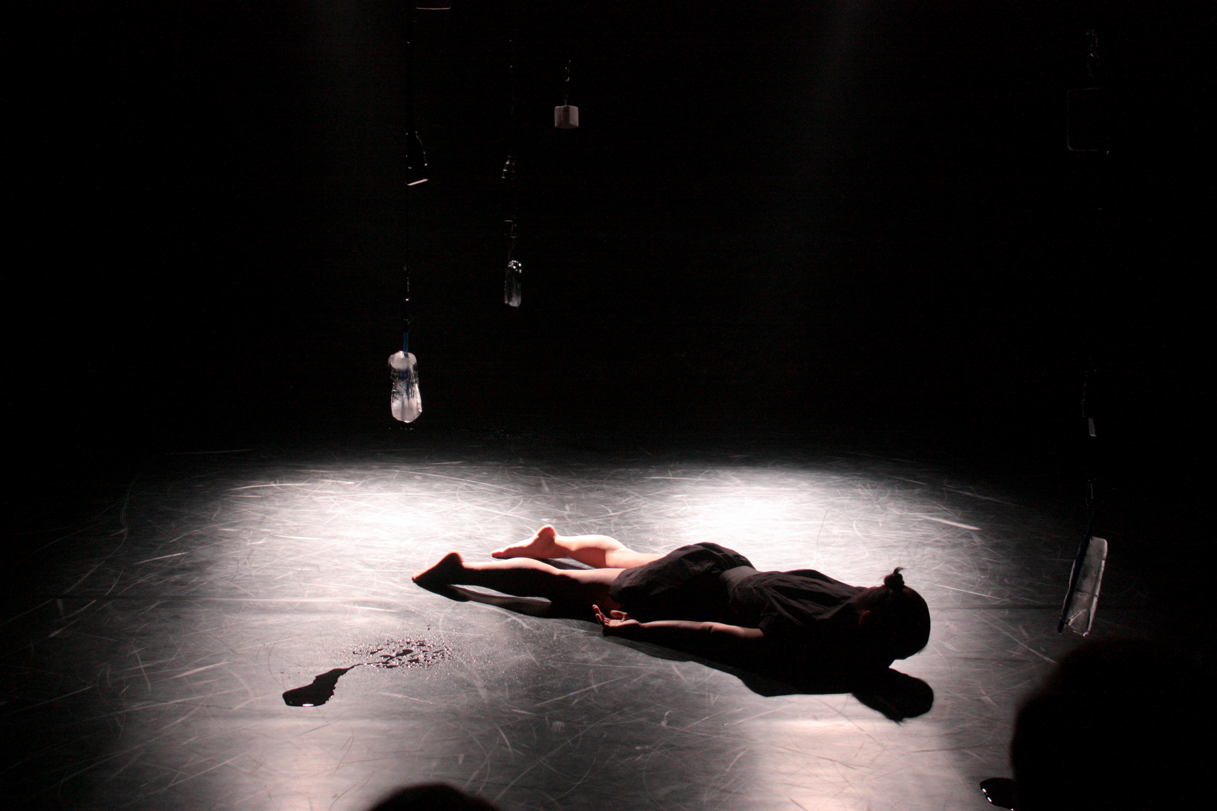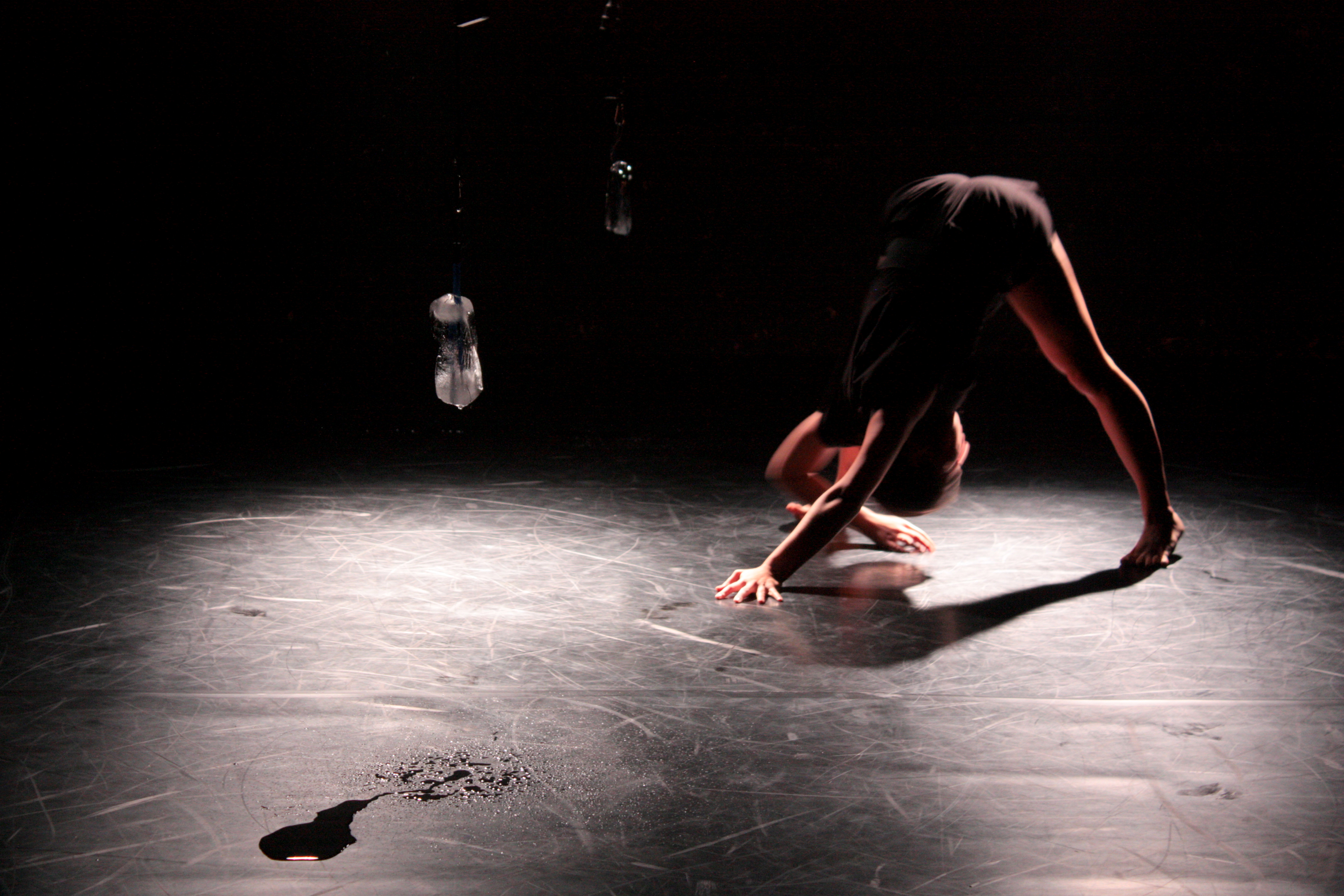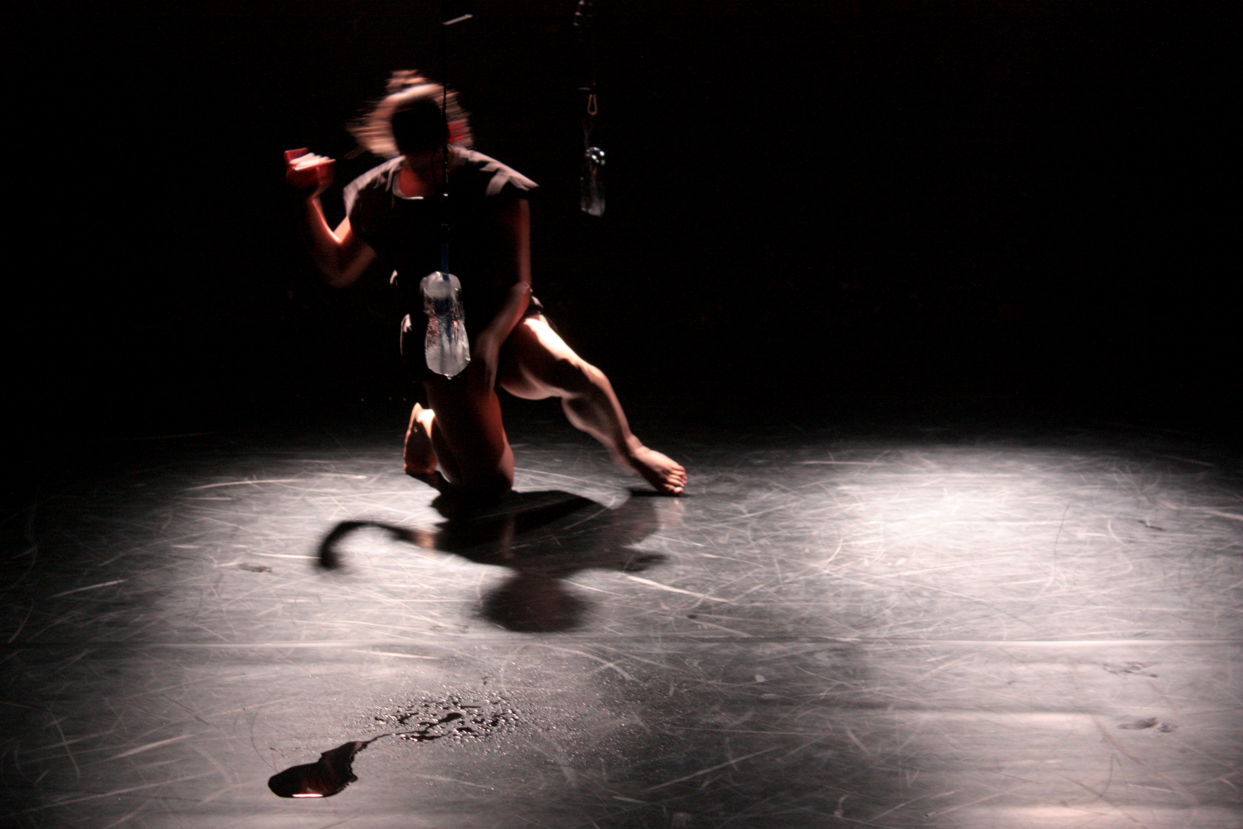 LANDing begins with the circular running of a person that is in an unstable mental and physical condition. The set is composed by hanging pairs of ice and plaster blocks that counter-balance each other. The plaster blocks represent the stable structures of a sociocultural environment while the ice blocks, depending on the conditions that they are exposed, are changing by becoming liquid. They depict the ephemerality and the transformability of a human being that moves forward in order to redefine itself within a multi-demanding contemporary lifestyle.