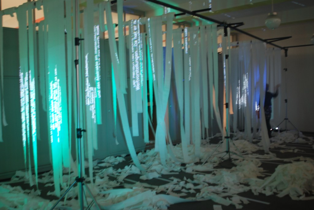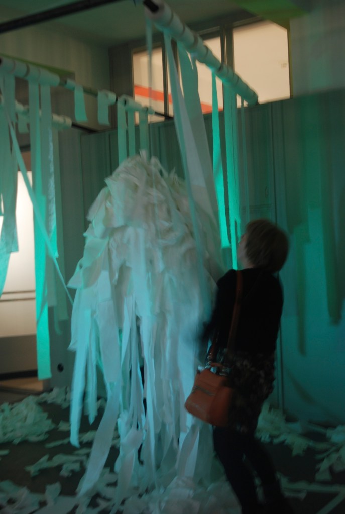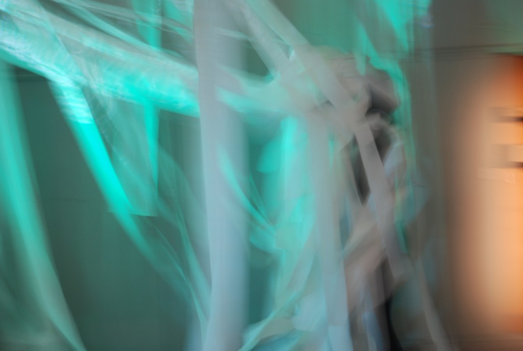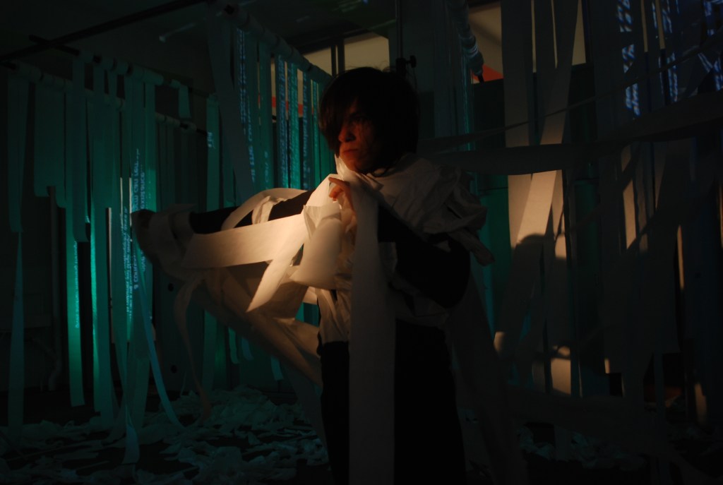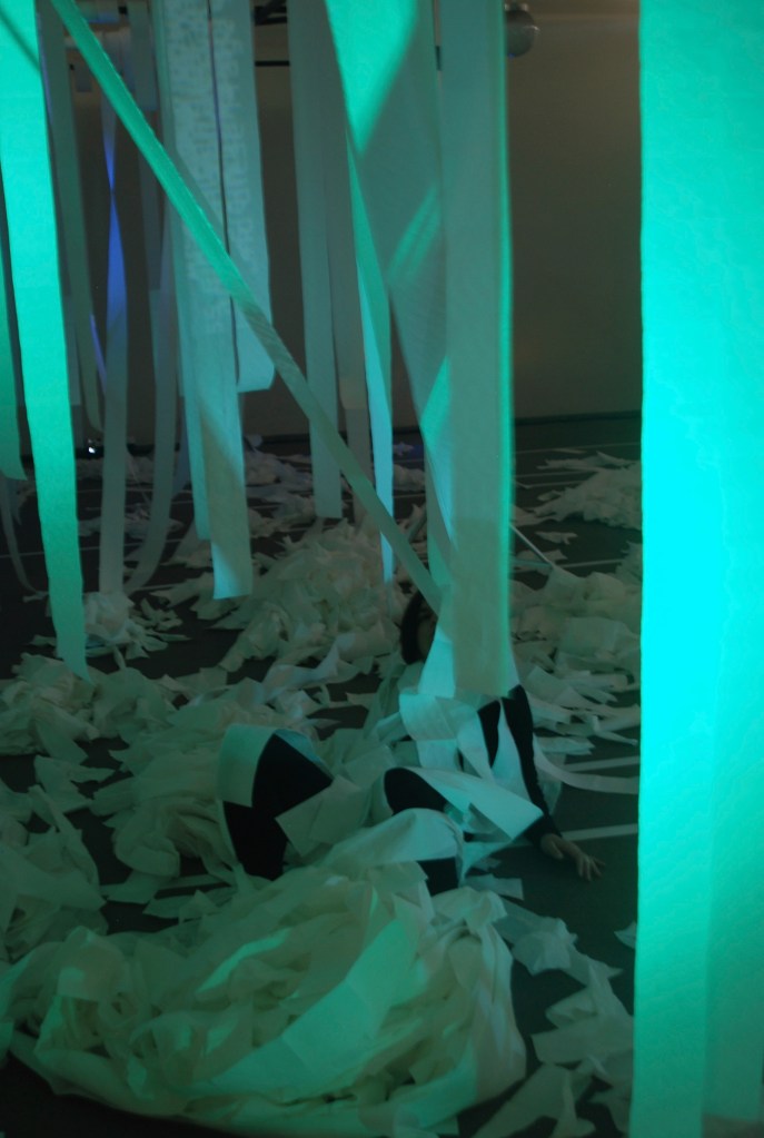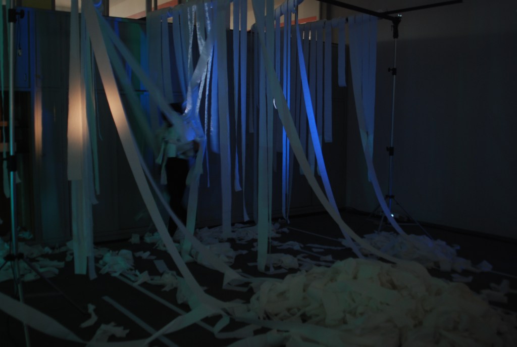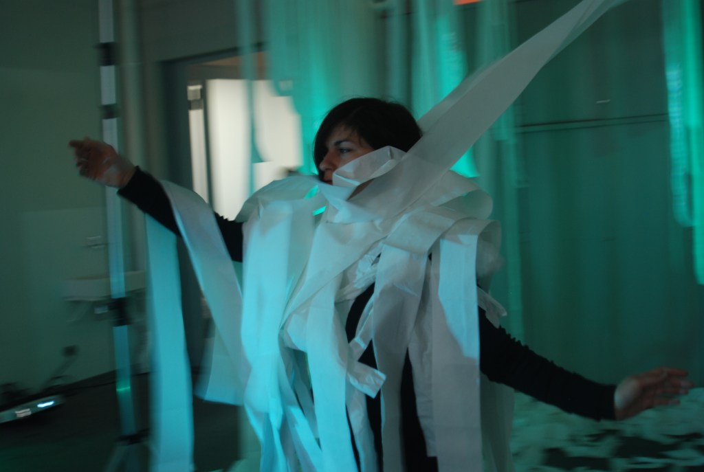 The audience is invited to move through the space and to interact with the landscape of soft white paper that bounds to gravity. The landscape changes constantly as a result of movement. At a certain point it becomes one person’s costume. Based on the principles of Bauhaus performances, Paper-traced attempts to combine the space, the movement of the body through the use of a certain material. In the process, new audio-visual atmospheres are created as well as unreal forms of space and human existence.